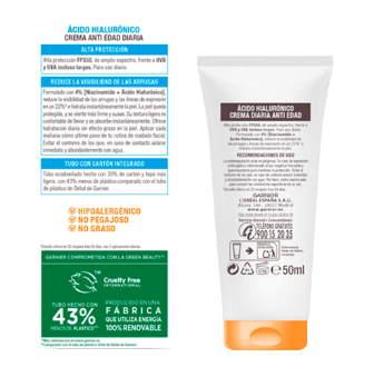 Garnier Delial SUPER UV con Niacinamida y Ácido Hialurónico FPS50 Crema Facial Anti edad, ofrece una alta protección diaria contra los rayos UVB y UVA incluso largos. Con un acabado no graso, este fotoprotector diario reduce la visibilidad de las arrugas y las líneas de expresión hidratando instantáneamente la piel.
