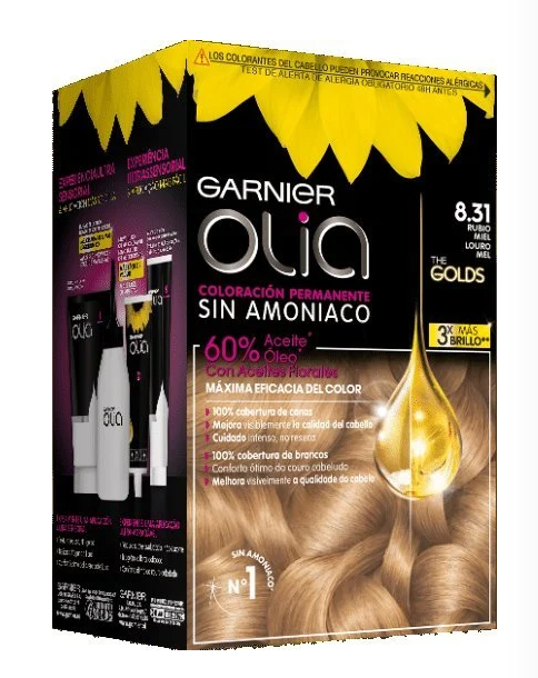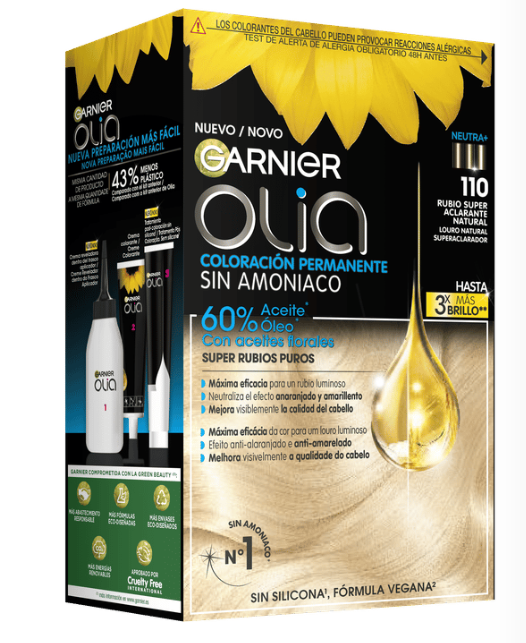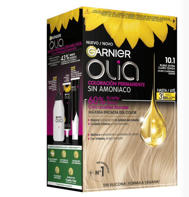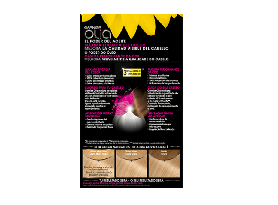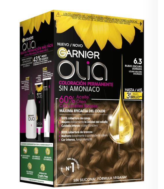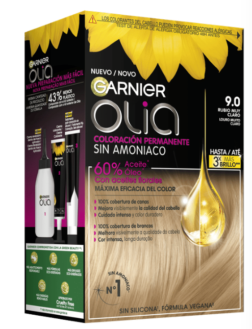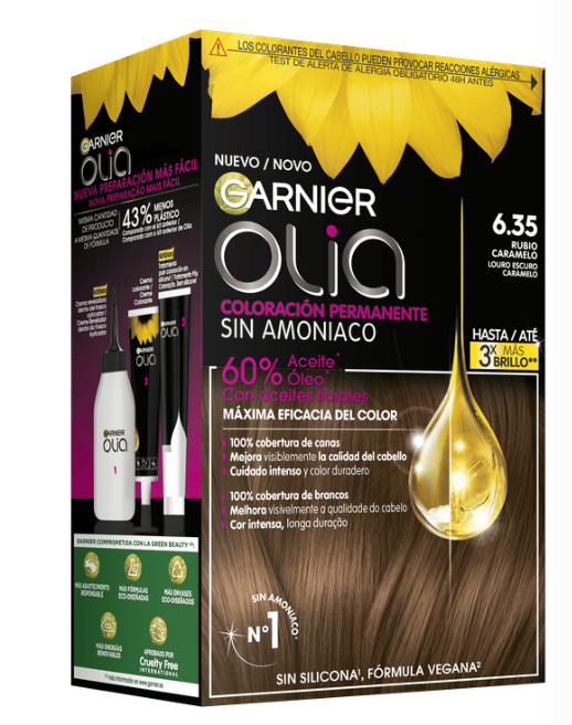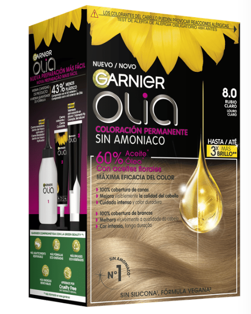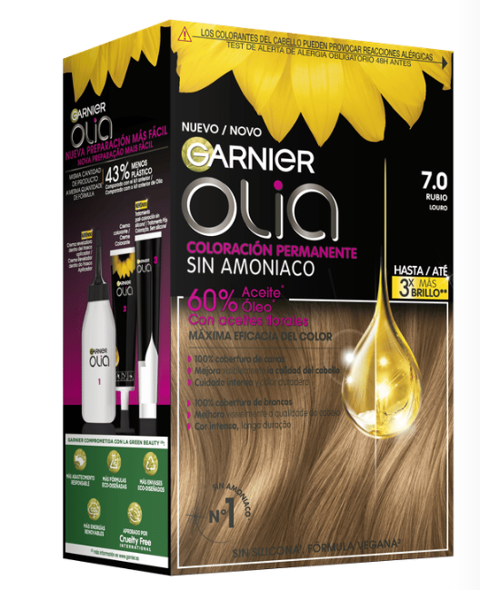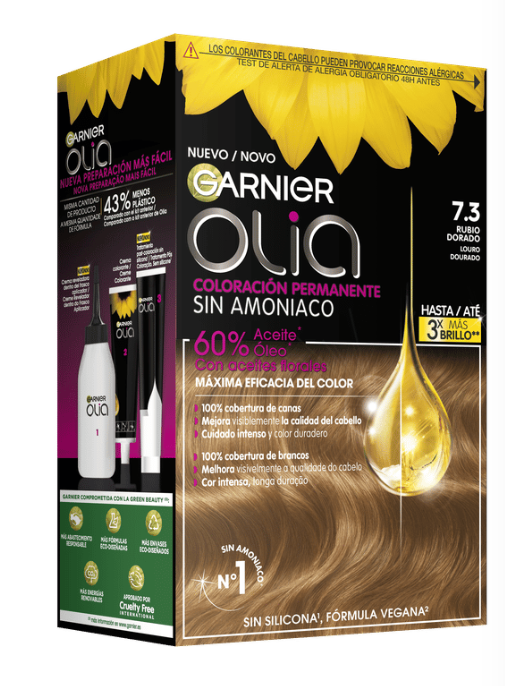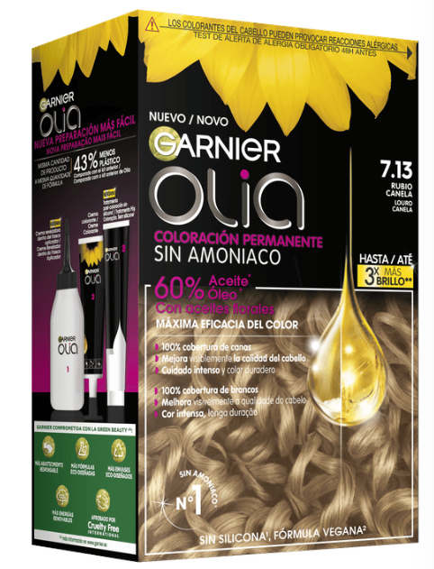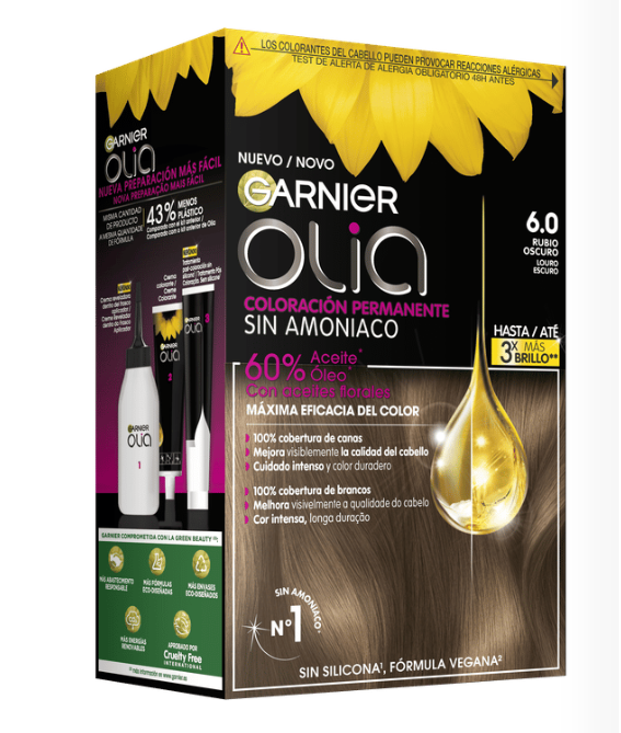 Garnier Olia es una coloración permanente con aceites florales de origen natural, sin amoniaco para un olor agradable y respeto del cuero cabelludo. Coloración tras coloración, mejora visiblemente la calidad de tu pelo para un color intenso más brillante y más bonito, y un pelo sedoso y cuidado. 100% cobertura de canas.