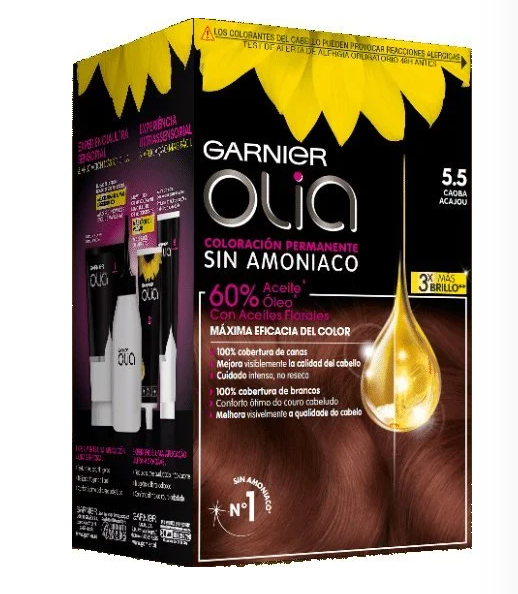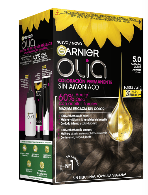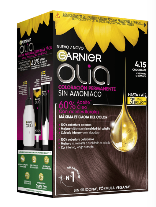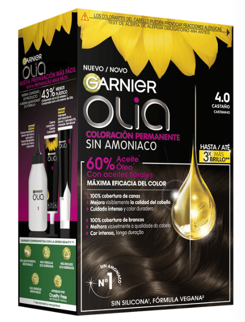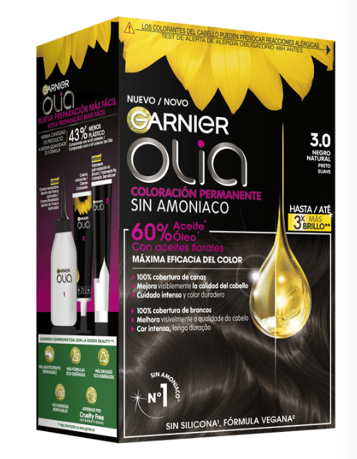 Garnier Olia es una coloración permanente con aceites florales de origen natural, sin amoniaco para un olor agradable y respeto del cuero cabelludo. Coloración tras coloración, mejora visiblemente la calidad de tu pelo para un color intenso más brillante y más bonito, y un pelo sedoso y cuidado. 100% cobertura de canas.